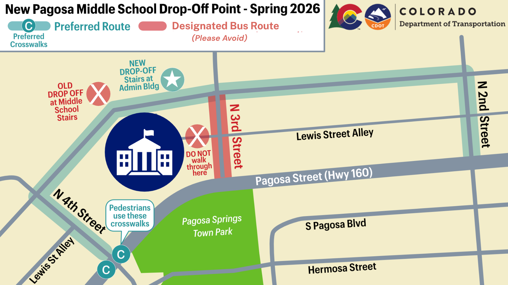 Starting Wednesday, March 11, the intersection of Hwy 160 & Lewis St will close as part of the US 160 Pagosa Springs Reconstruction Project, impacting middle school drop-off and pick-up traffic. Check the map for new routes and drop-off locations.