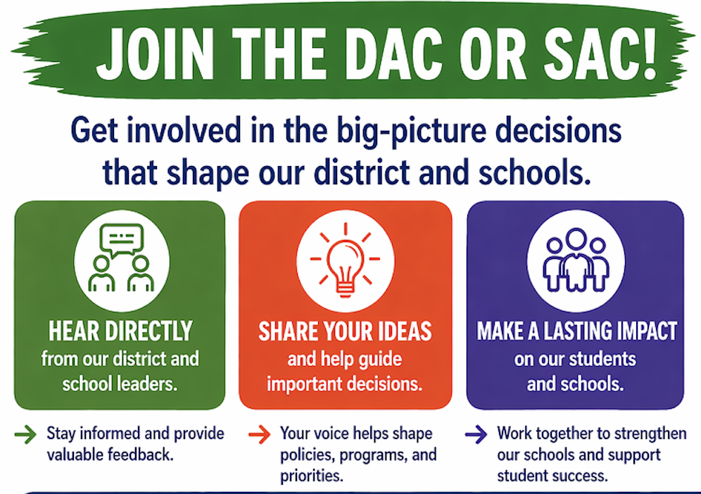 Are you looking for a way to get involved in the strategic thinking of your district or school? Do you want to hear directly from school and district leadership—and share your ideas on important decisions? DAC and SAC are great places to do just that.